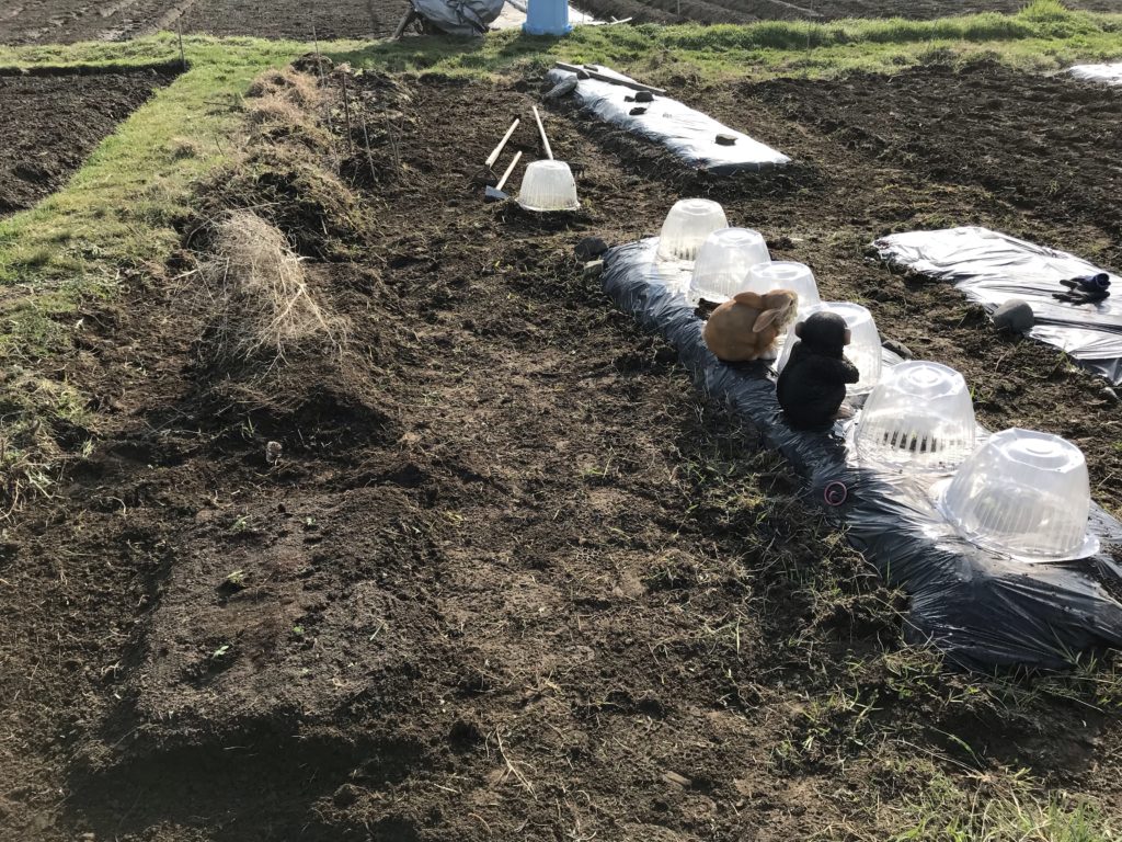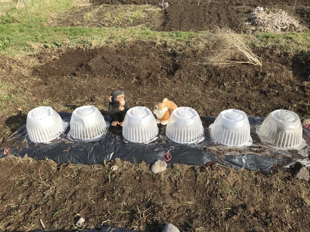 ナス4株・ピーマン2株を植付して、ホットキャップで保温。