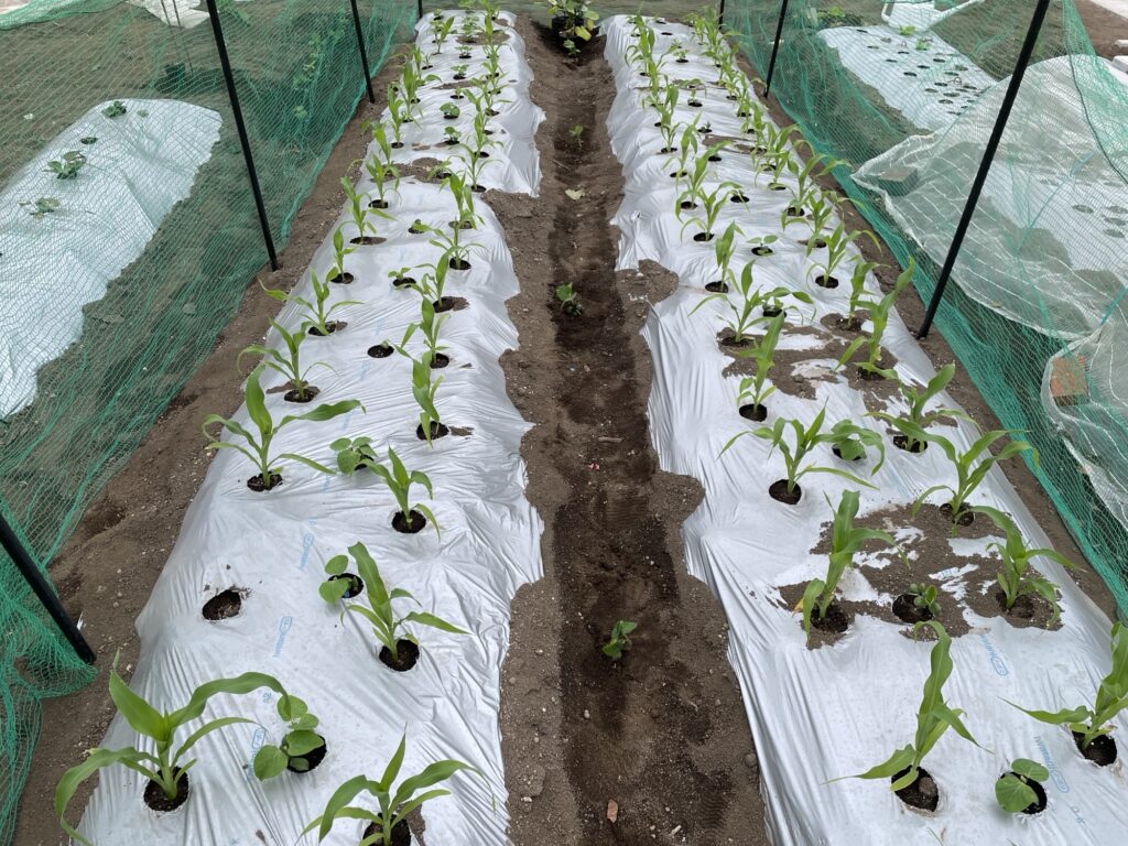 5月29日(種まきから約50日後)、トマトの間にバジル・青しそを植付。